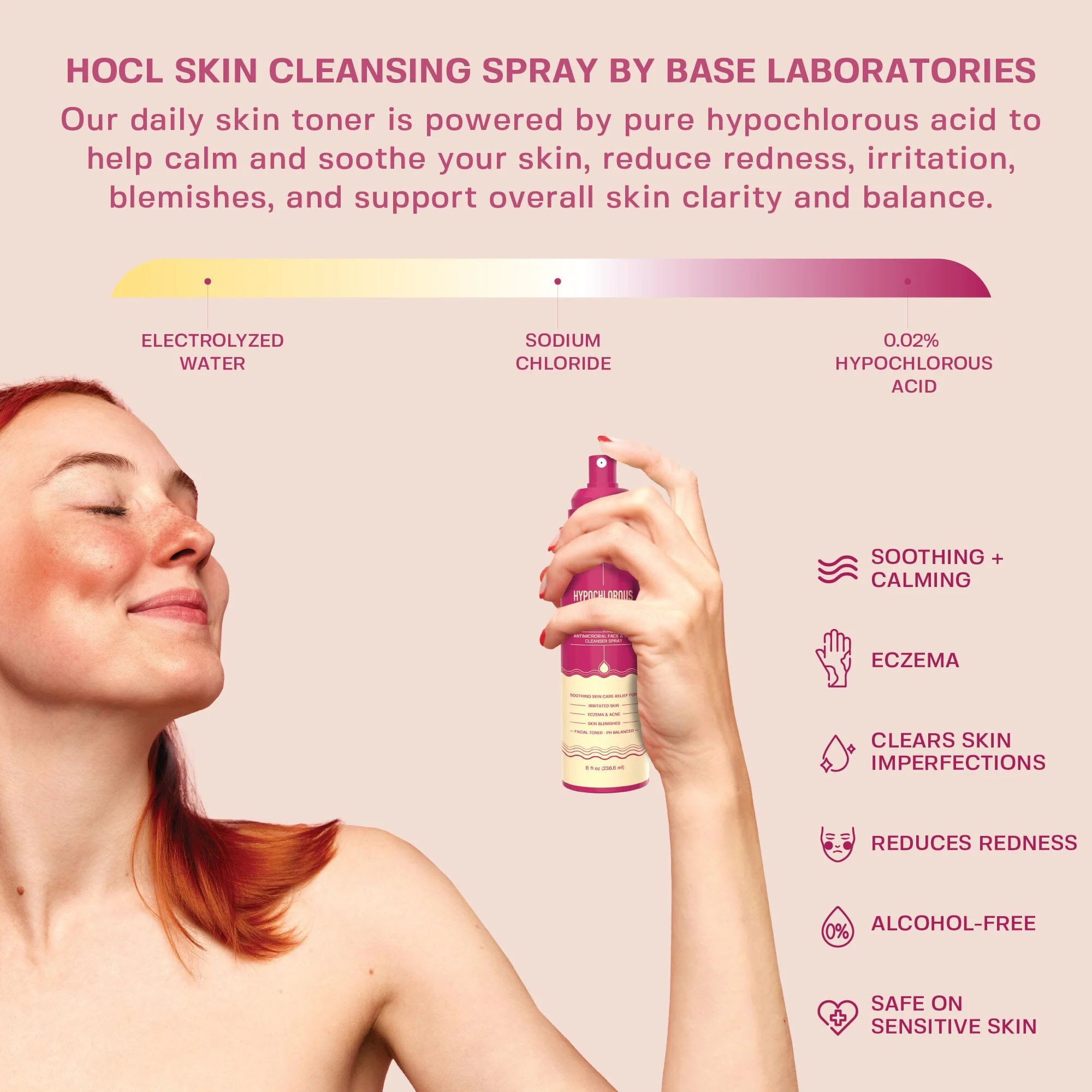 Base Laboratories Hypochlorous Acid Skin Repair Spray 3-IN-1 HEALING SKIN SPRAY - Soothe, cleanse, and restore your skin with Base Laboratories Hypochlorous Acid Spray, a powerful yet gentle daily skin repair solution. Powered by pure Hypochlorous Acid (HOCl) — a naturally occurring molecule in the body — this antimicrobial facial spray calms redness, reduces irritation, and accelerates healing. Infused with sodium chloride and electrolyzed water, it balances your skin’s pH and supports a clear, calm complexion. Ideal for all skin types, including sensitive skin, and safe for adults, kids, and babies.